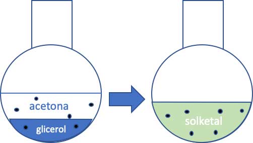 Queríamos ver cómo reaccionan la glicerina con la ayuda del catalizador preparado. Al principio, aunque ponemos juntas la acetona y la glicerina, no se mezclan, ocurre lo mismo que cuando ponemos en un vaso agua y aceite, y vemos los dos fases a simple vista. Pero cuando añadimos el catalizador y agitamos durante un tiempo, podemos ver que ahora solamente vemos un fase. Esto nos indica que la reacción se está produciendo y que se está generando un nuevo compuesto (cambio químico). Este nuevo compuesto se llama solketal y es un disolvente que tiene unas propiedades muy interesantes.