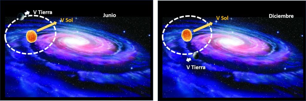 Esta modulación anual (Fig. 1) tiene su origen en que nos estamos moviendo a lo largo del año junto con el Sol en torno al centro de la Vía Láctea, nuestra galaxia. Como todas las galaxias, la Vía Láctea está rodeada por un halo de materia oscura. Durante una parte del año el movimiento de la Tierra se suma al del Sol, pero el resto del tiempo se resta y por eso nos movemos más o menos rápido al chocar contra la materia oscura en función de si estamos en verano (cuando se suman las velocidades) o en invierno (cuando se restan).