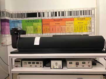 En estos trabajos, donde se ha muestreado casi 5.000 m metros de serie, ha sido necesaria la colaboración entre investigadores de la Universidad de Zaragoza, de la Universidad de Barcelona y del Instituto Geológico y Minero de España (CSIC). Al trabajo de campo de recogida de muestras y descripción de la serie estratigráfica, le sigue el trabajo de laboratorio, donde se cortan las muestras a tamaño estándar. Este tamaño estándar es el de un cilindro de unos 2 cm de altura por unos 2 cm de diámetro (Fig. 6). Este tamaño es el necesario para realizar las medidas de la remanencia natural de las rocas, es decir, la memoria magnética que queda en las rocas sometidas a un campo magnético. Para ello, se ha utilizado un horno (Fig. 7), que calienta y enfría las muestras en campo cero (sin campo magnético que les afecte), y un magnetómetro criogénico (Fig. 8).