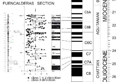 De esta manera, tras la desmagnetización por pasos de cada muestra, para cada nivel muestreado contamos con la información magnética original y podemos colorear por tramos en blanco y negro las magnetozonas locales. El negro se usa para la polaridad normal (la actual) y el blanco para la inversa. Así se construye la secuencia local de magnetozonas, coloreando en una columna al lado de la columna estratigráfica esos cambios de polaridad (Fig. 9). Además, se utilizan los datos numéricos de los vectores paleomagnéticos para colocar la posición virtual del polo geomagnético, que ha de estar próxima a +90º (polaridad normal) o a -90º (polaridad inversa). Seguidamente se compara la secuencia de polaridad registrada en los sedimentos, con la secuencia de una edad que se ha consensuado a escala global. Para ello se selecciona el tramo de escala global que se aproxima a la edad esperable en la zona local. En el caso que nos ocupa, se toma la sección de escala global entre el Eoceno superior y el Mioceno inferior. Puede haber cambios de polaridad que no han quedado registradas localmente o al revés, que haya habido alguna transformación local que haya producido aparentes cambios de polaridad. Es por ello que la correlación entre lo local y lo global es más adecuada si la serie local es larga.